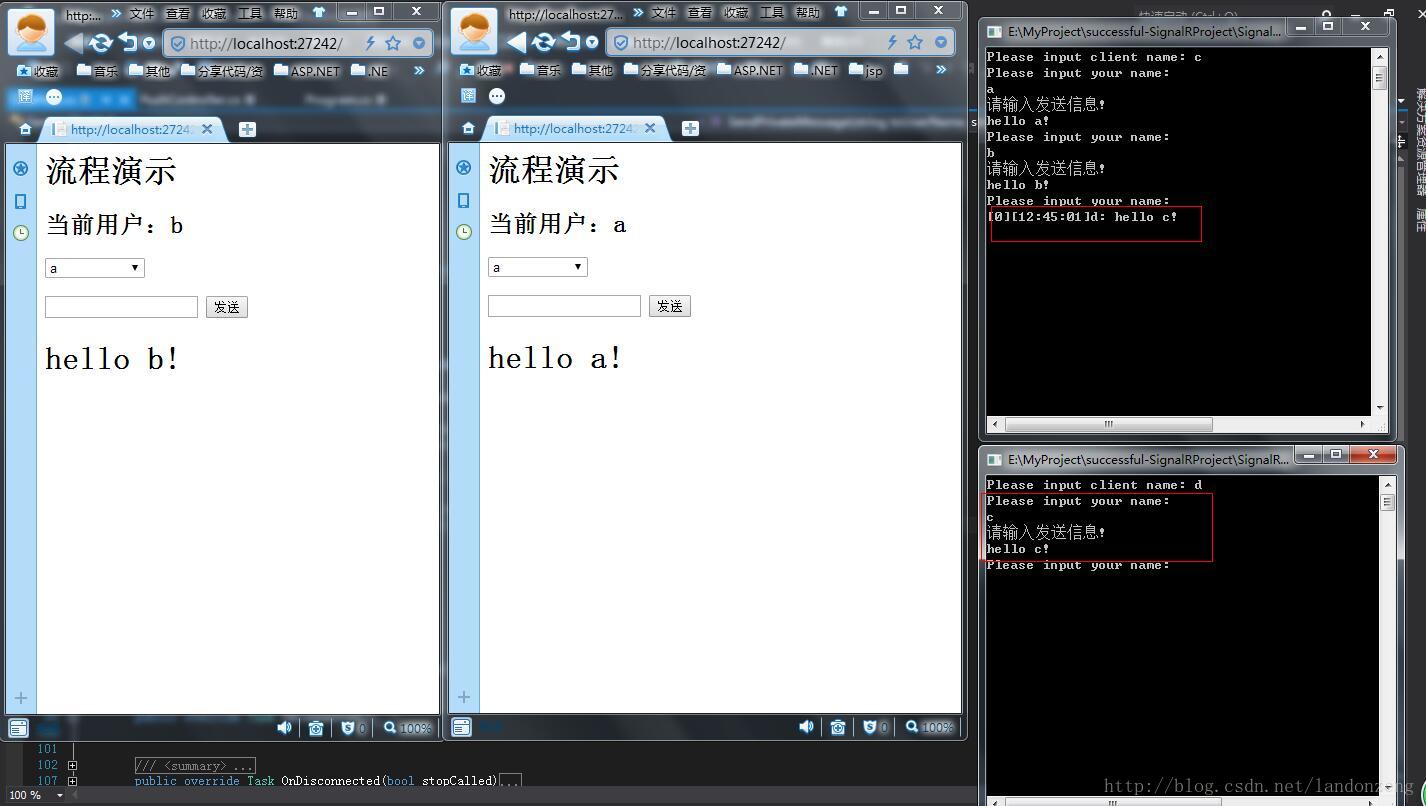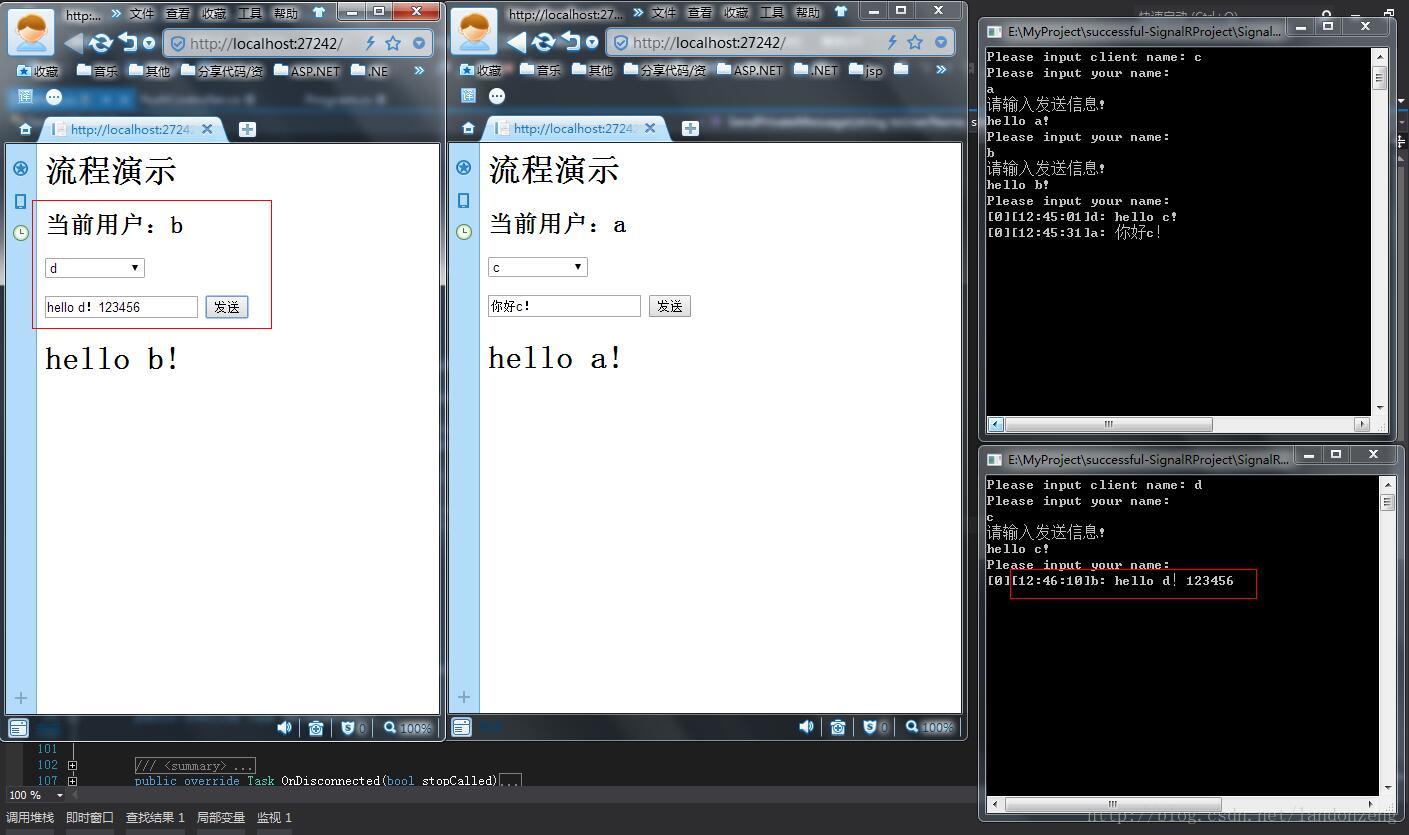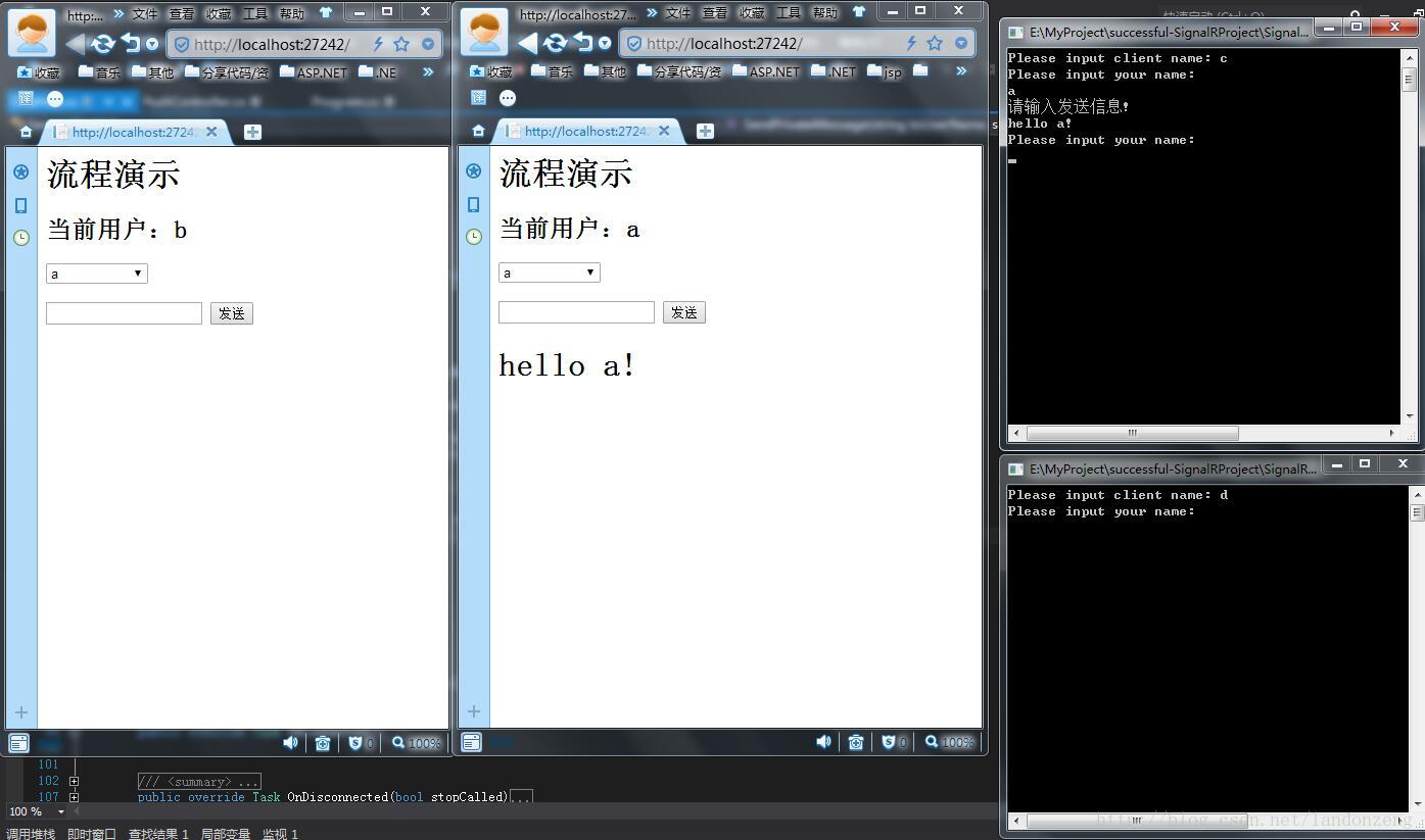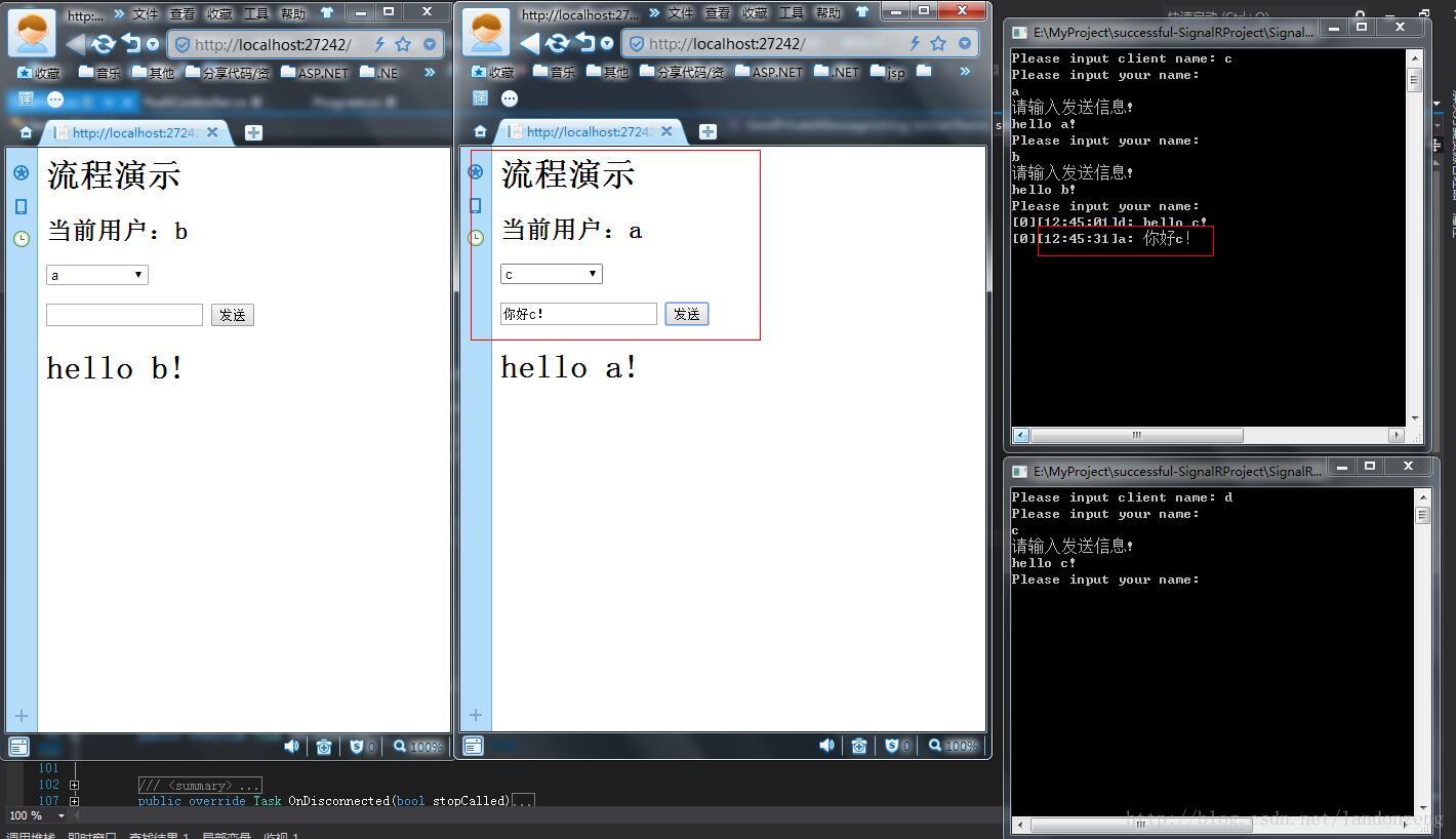 8、如果a、b之间消息传送没问题,证明web端消息传送成功,这个时候打开我们前一章中的Client控制台项目,运行该项目下bin中的Clinet.exe,打卡两个程序,输入登录名为c、b