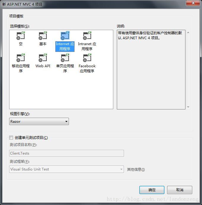 3、根据自己实际情况选择对应的项目模板,这里为了做演示,选择Internet应用程序