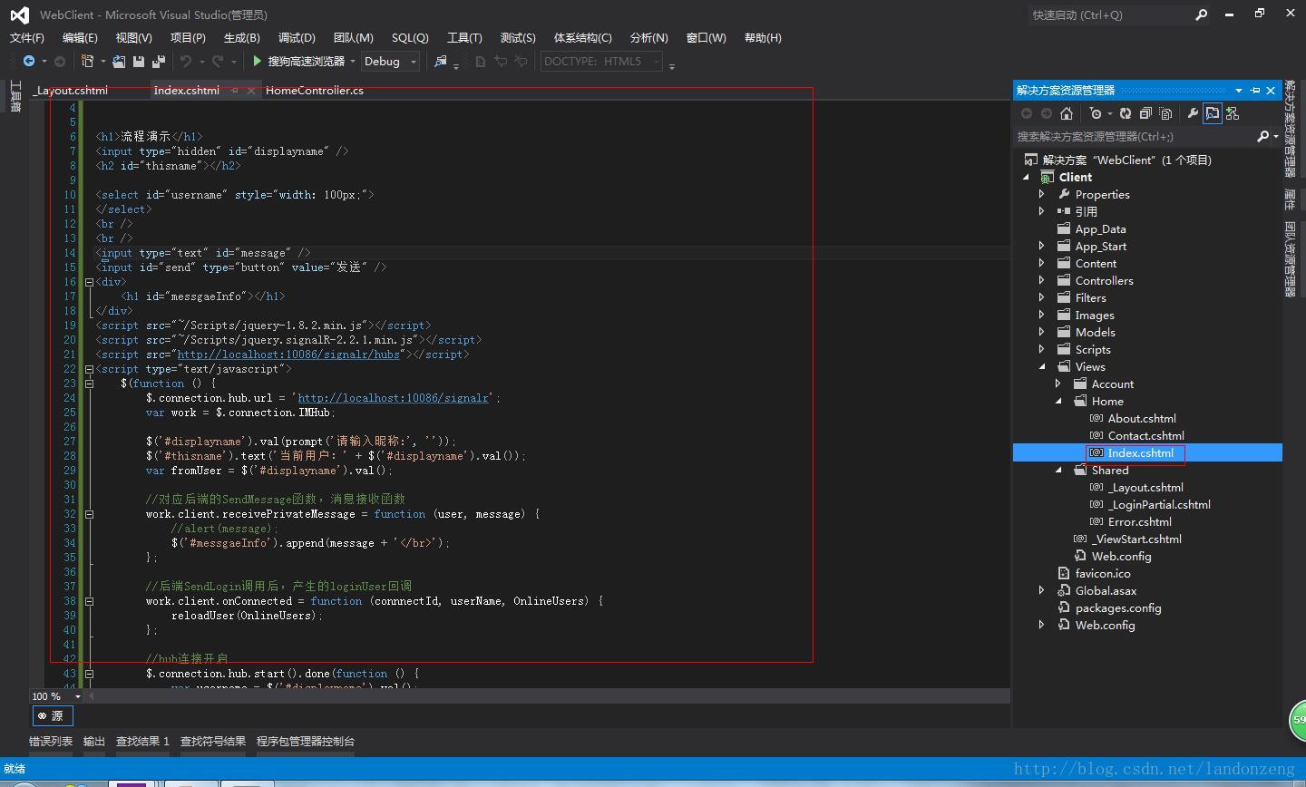 Install-Package Microsoft.AspNet.SignalR.JS5、修改项目中Views下Homge文件夹中的Index.cshtml文件代码,如下