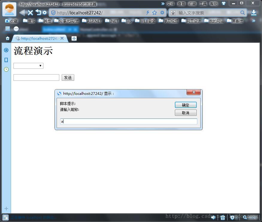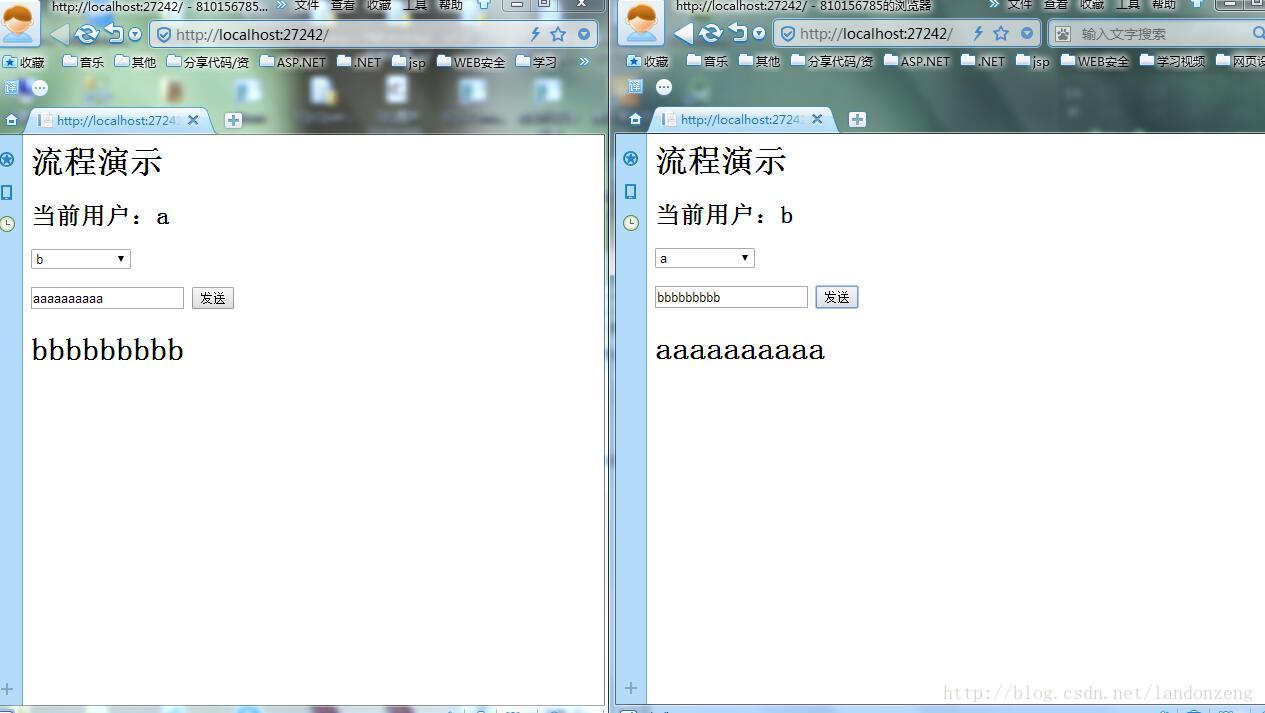7、然后打开另一个浏览器,如上步骤,输入b用户登录,a用户选择下拉项中的b(下拉选项在有用户登录时会自动添加新用户进去),b用户选择a,相互之间发送一下信息进行测试,结果如下