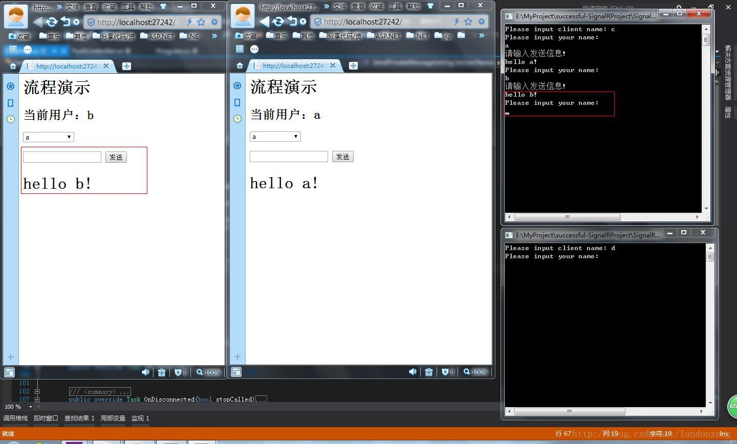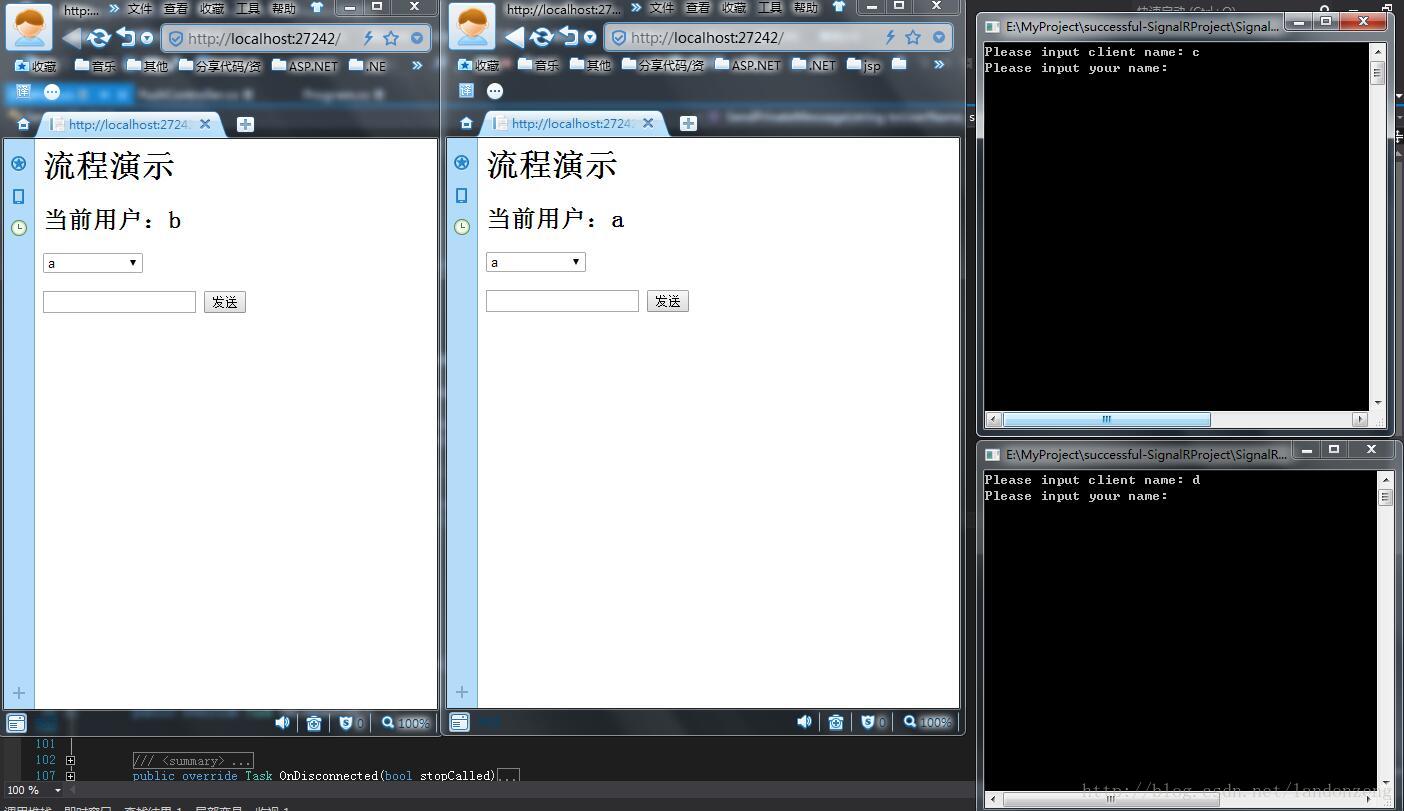 8、如果a、b之间消息传送没问题,证明web端消息传送成功,这个时候打开我们前一章中的Client控制台项目,运行该项目下bin中的Clinet.exe,打卡两个程序,输入登录名为c、b